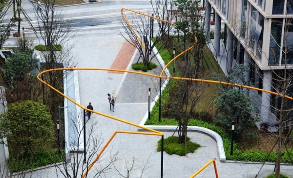 3月12日,在重庆首个国家级广告试点园区——重庆广告产业园内,一根黄色水管架在半空中输送水源,水管弯弯曲曲不规则分布,格外引人注目,远远望去,好似盘旋在空中的轨道,被称为“最任性的水管”。