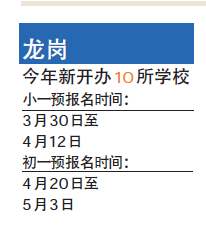 另外,龙岗区今年新开办中小学校有10个,其中小学有华南师范大学附属大运学校、文景小学、雅宝小学等6所,初中有龙岭初级中学公办班、沙塘布学校等4所。此外,今年还有4所改扩建学校,包括宝龙学校(龙岗)、区实验学校(龙城)、万科城实验学校(坂田)、天成学校(龙城)。龙岗区教育局还提醒家长,预报名后须在规定时间内向地段内学校提交材料申请学位。教育行政部门对在规定时间内未向学校提交材料申请学位的,符合条件的本地户籍学生不保证就近安排学位,非深户籍学生不安排学位。(晶报记者 张一鎏)