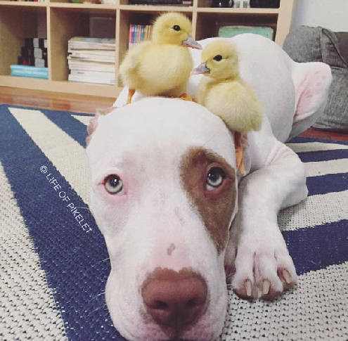 因为小鸭子太小了,Pikelet和Patty Cakes每天的大部分时间就是在保护它们,小心翼翼生怕它们受伤。在两位狗爸爸的保护下,小鸭子胆子越来越大,动不动就往身上跑。