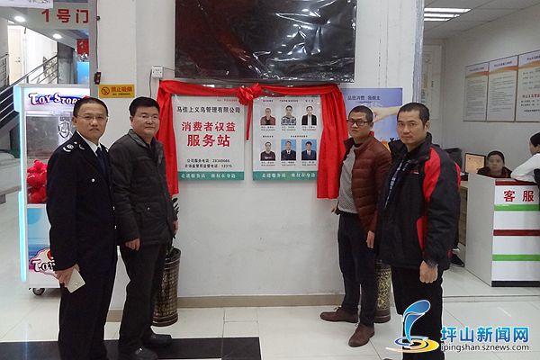 当天,市市场和质量监管委坪山局三位负责人分别在金地朗悦物业管理服务中心、马佳上义乌管理有限公司、中龙食品有限公司为新建的消费者权益服务站揭牌。
