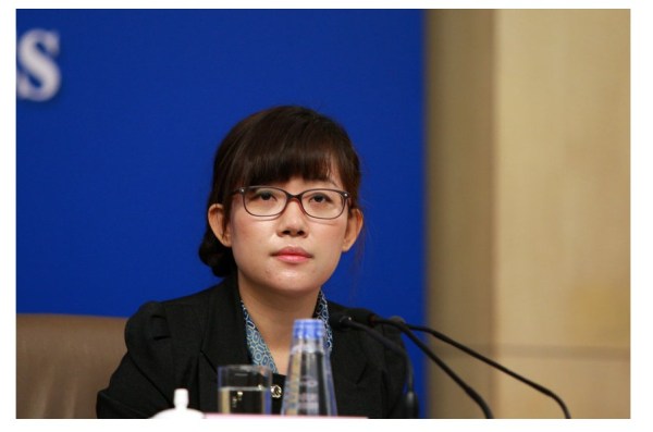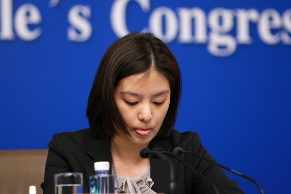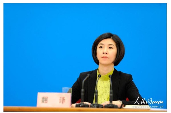 2012年3月6日上午10时,第十一届全国人民代表大会第五次会议在人民大会堂三楼金色大厅举行记者会,由外交部部长杨洁篪就我国的对外政策和对外关系回答记者提问。图为高级翻译张璐,外交学院国际法系1996级学生。