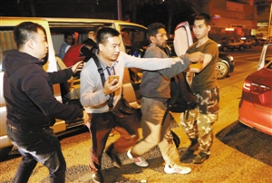 图为边防官兵现场拦截偷渡车辆并将偷渡人员带下车。