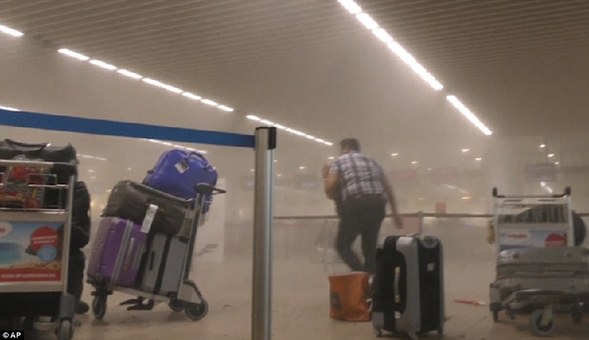 当地时间2016年3月22日上午,在比利时首都布鲁塞尔机场和地铁站发生的系列爆炸袭击已造成34人死亡,超过170人受伤。极端组织“伊斯兰国”宣称制造了袭击事件。国际社会对这一事件表示谴责,呼吁打击一切形式的恐怖主义。图为爆炸现场画面曝光,机场内满是浓烟,行李四处散落,乘客趴在地上躲避。