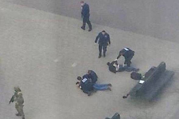 在布鲁塞尔市中心北车站附近,嫌疑人被警察戴上手铐。