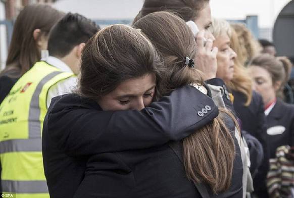 在乘客和工作人员撤离布鲁塞尔机场时,两名女子拥抱安慰。
