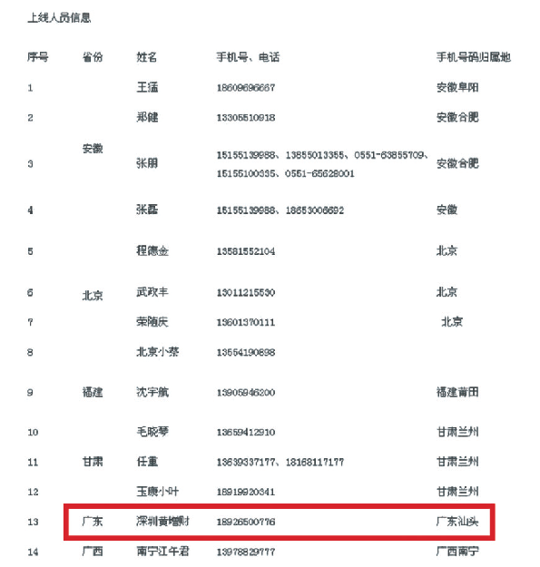 记者发现,在公告的上线人员信息名单中,有一名人员信息涉及广东省,姓名为深圳黄增财,电话号码归属地为广东汕头。在下线人员信息名单中,有两名人员属于广东省,姓名为揭阳黄坤进、李其爱,电话号码归属地为广东揭阳及广东湛江。