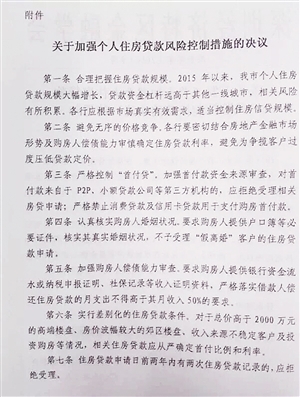 《决议》的“附件”中,详细列出了9项措施一是要合理把握住房贷款规模;二是避免无序价格竞争(指“贷款利率”);三是严格控制“首付贷”;四是认真核实购房人婚姻状况;五是加强购房人偿债能力审查;六是实行差别化住房贷款条件;七是住房贷款申请日前两年内有两次住房贷款记录的,应拒绝受理;八是严格个人再交易住房贷款首付款资金监管,在银行监管比例不得