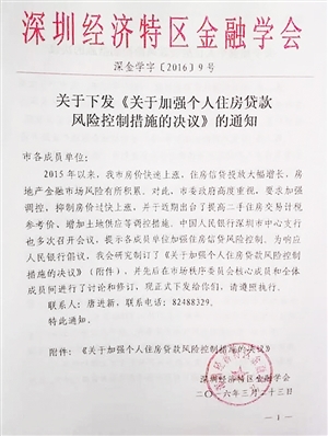昨日一份《关于加强个人住房贷款风险控制措施的决议》通知文件在深圳市民的朋友圈中广为传播,该文件由深圳经济特区金融学会3月23日下发给各会员单位,要求3月28日起执行决议内容。