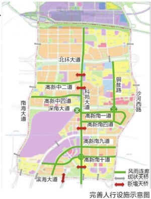 《方案》提出,要完善人行设施,结合科苑大道提升打造风雨连廊网络,共计8条、长约13公里,重点推进北区空中连廊的建设,新建人行天桥5处;要完善自行车车道网络及停车设施,单侧自行车专用道道路5条、约9公里,双侧自行车专用道道路4条、约6公里,完善高新园站A、B出口停车场扩容至42平方米,深大站A2与C出口各增设停车场1处,面积为35平方米和100平方米;科苑站C出口停车场扩容至220平方米,B出口增设一处停车场,面积200平方米;区内所有未建项目必须落实自行车停车场配建;对于现状未配建的,增加自行车停车场。同时,以轨道站点、公交站点、各写字楼为中心逐步开展公共自行车租赁业务,设置自行车租赁点。
