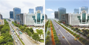 科苑大道总体提升效果对比图。(左:现状。右:效果图。)
