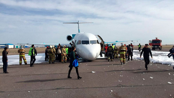 据俄新社3月27日报道,一架客机27日因前起落架故障在哈萨克斯坦阿斯塔纳国际机场紧急迫降,机腹着陆,机头“铲地”向前滑行约30米,机上乘客无一伤亡。图为哈萨克斯坦一客机起落架出故障机头“铲地”迫降。