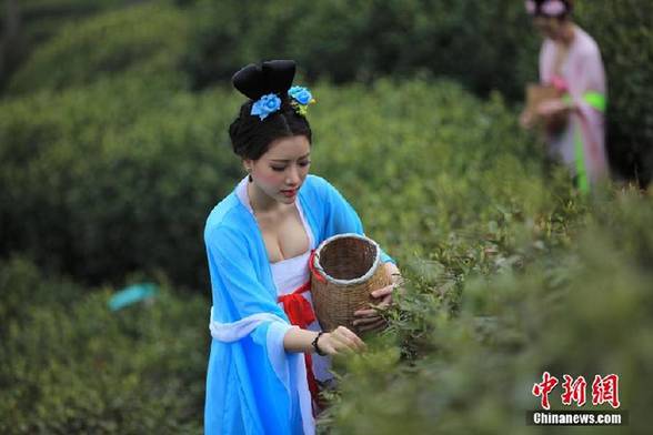3月30日,一群身着唐装的美女走进某景区踏青采茶,从采茶、制茶、泡茶、品茶中演绎古法工艺,展现茶文化的优雅和宁静。中新社发张敬珍 摄