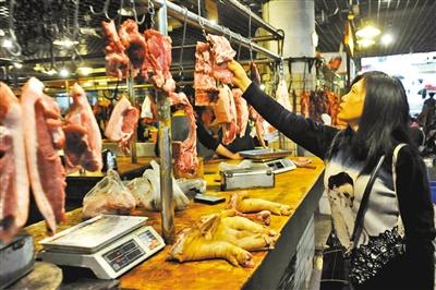 江北银鑫菜市场,市民在选购猪肉。 本报记者 李斌 摄