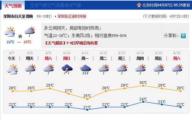 随着清明小长假的结束,深圳正式进入了强降水多发季节。据深圳气象台预测,今年4月深圳天气将呈“强对流天气多发,阶段性降水频密,天气转热”的特点。预计4月我市共有10-15天的雨日,此外,据气象图显示,接下来10天深圳都将有雨。由于近日雨雾天气多,能见度低,市民请注意交通安全。