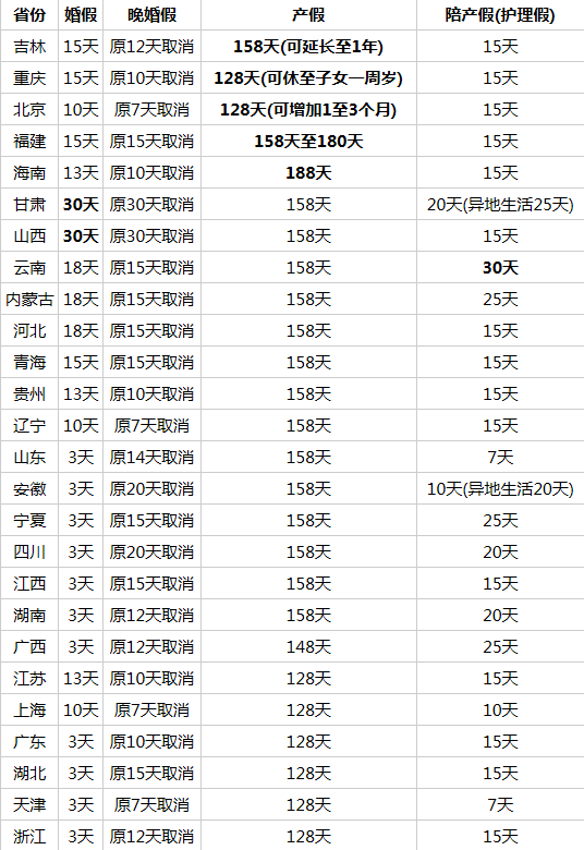 自2015年12月27日全国人大常委会审议通过修订后的《人口与计划生育法》以来,各地相继开始修订地方计生条例。据查,目前至少已有26省份(名单如上表)的新计生条例正式出台。这26个地方在新规定中均取消了晚婚假,同时对产假和男性陪产、护理假做出一定调整。调整后,山西、甘肃婚假达30天,吉林女性产假可延长至一年,重庆女性产假在128天基础上可延长休至子女一周岁,云南的男方护理假有30天。