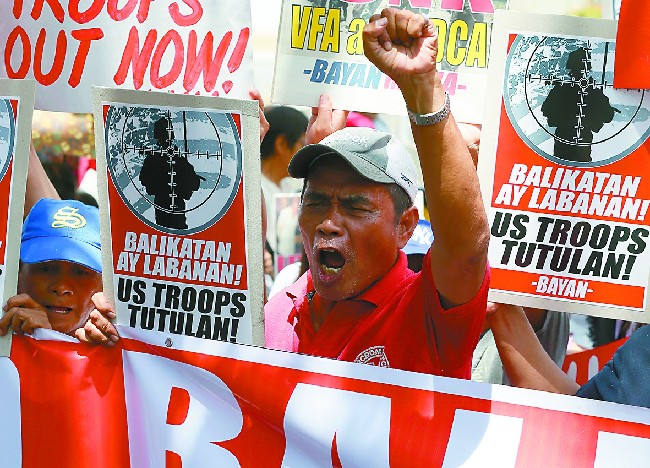 4日,马尼拉市民在美国大使馆门前抗议美菲军演。