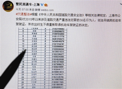 昨日,上海集中公布终生禁驾名单,图为上海警方在互联网上公布的相关信息。新华社记者 陈飞 摄