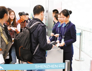 深圳机场全力做好航班保障及旅客服务。图为昨日旅客正在有序登机。