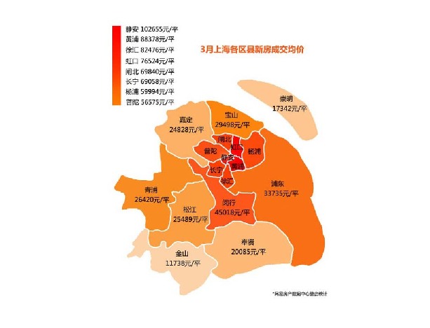 据网易房产数据中心统计,截止到2016年3月31日,上海住宅网签18666套;共计成交面积约232万方;成交均价32868元/平米。其中成交均价最高的仍是静安板块,其次分别为黄浦、徐汇区域。从图中可以看出,市区的房价基本在6万/平左右,静安区的均价已破10万/平。