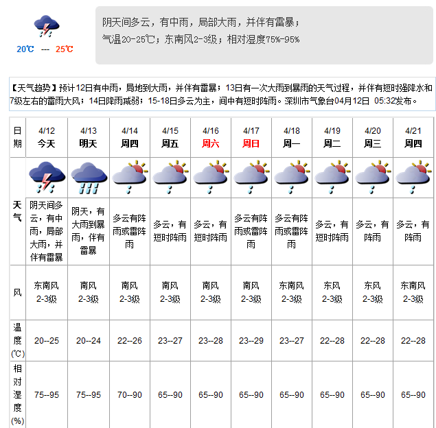 市气象局预测,预计12-13日深圳天气持续不稳定,12日南风加强北推、13日切变线南压的过程中还将出现雷雨天气,雨量分布不均,部分地区雨量仍可达暴雨量级,伴有短时强降水和7级左右的雷雨大风;14日起降水减弱,转阳光与阵雨相伴的天气。
