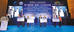 在第二届深港(前海)人才合作年会上,嘉宾为企业颁发前海境外高端人才和紧缺人才个人所得税财政补贴。(资料图片) 深圳商报记者钟华登 摄