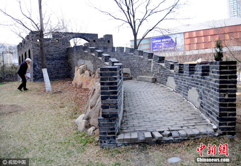 4月11日,辽宁省沈阳市,一长近10米的山寨“长城”亮相沈阳一小区,遭市民吐槽。市民表示,该“长城”在外表上就不像,而且做工粗糙,容易对儿童造成负面影响。图片来源:视觉中国