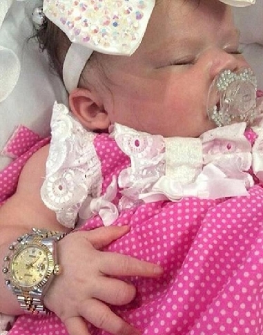 土豪妈妈任性打扮新生宝宝奶嘴镶钻 2014年12月消息,外媒曝光了一张来5个月土豪宝宝的照片,小肉手腕挂着劳力士手表,口里叼着镶钻奶嘴正在熟睡。据了解,这位宝宝居住在英国普利茅斯市,虽然只有5个月大,但她的衣橱已经塞满了各种名贵衣裙、饰品,其中包括价值近8000元的钻石耳环、近2.7万元的劳力士手表,约1500多元的古奇名牌包。而她的妈妈是一位20岁的单亲妈妈,目前在普利茅斯市经营一家美容院。