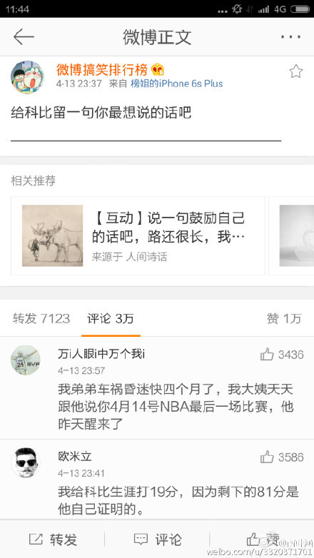 科比告别战刷爆朋友圈 恶搞逗趣总关情