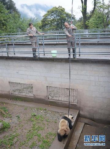 4月14日,在中国大熊猫保护研究中心雅安碧峰峡基地,工作人员在帮助大熊猫“苏珊”做自然交配前的准备。目前,中国大熊猫保护研究中心的大熊猫繁育进入高峰期,该中心拥有全球最大圈养大熊猫种群。据悉,截至2015年底,该中心圈养大熊猫数量达到218只。该中心2016年计划为26只雌性大熊猫配种,目前已有15只完成配种,其今年圈养大熊猫繁育配种任务已完成过半。新华社记者薛玉斌 摄