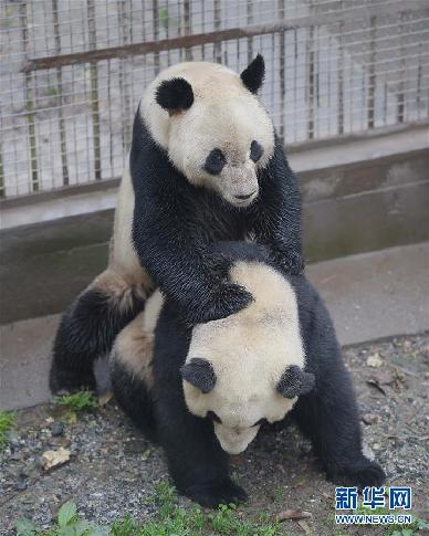 4月14日,在中国大熊猫保护研究中心雅安碧峰峡基地,大熊猫“阳阳”(上)与大熊猫“苏珊”准备进行自然交配。目前,中国大熊猫保护研究中心的大熊猫繁育进入高峰期,该中心拥有全球最大圈养大熊猫种群。据悉,截至2015年底,该中心圈养大熊猫数量达到218只。该中心2016年计划为26只雌性大熊猫配种,目前已有15只完成配种,其今年圈养大熊猫繁育配种任务已完成过半。新华社记者薛玉斌 摄
