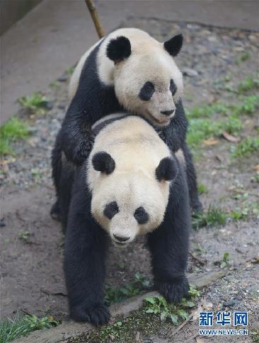 4月14日,在中国大熊猫保护研究中心雅安碧峰峡基地,大熊猫“阳阳”(上)与大熊猫“苏珊”准备进行自然交配。目前,中国大熊猫保护研究中心的大熊猫繁育进入高峰期,该中心拥有全球最大圈养大熊猫种群。据悉,截至2015年底,该中心圈养大熊猫数量达到218只。该中心2016年计划为26只雌性大熊猫配种,目前已有15只完成配种,其今年圈养大熊猫繁育配种任务已完成过半。新华社记者薛玉斌 摄