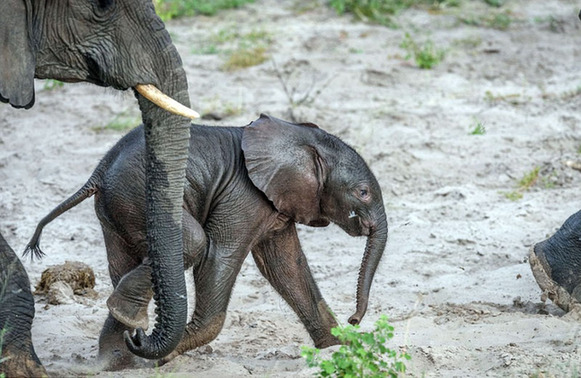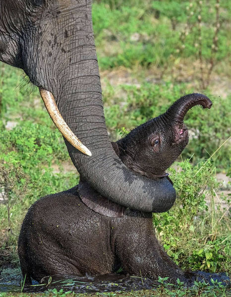 这只顽皮的小象原本在水中嬉戏,但当它想退回岸边时,却被泥巴牢牢困住,无法脱身。这时,站在一旁的象妈妈及时赶来,用鼻子缠住了宝宝的脖子,将其托起。快到岸边时,她用脚轻轻地踢了一下小象的臀部,帮助他成功地爬上了岸。
