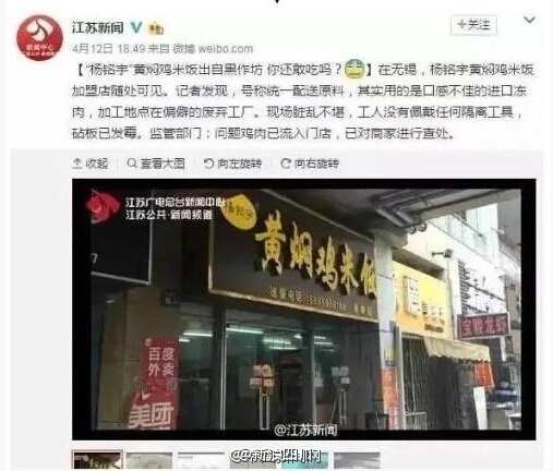 【黄焖鸡被曝用“僵尸肉”】据广西日报微博,近日,江苏新闻曝出无锡“杨铭宇”黄焖鸡,号称统一配送原料,却允许加盟店自行购买鸡肉,导致口感不佳的巴西进口冻肉流入市场,而加工地点竟在偏僻的废弃工厂:现场脏乱不堪,工人没有佩戴任何隔离工具,砧板已发霉…执法部门表示"将严肃查处"。