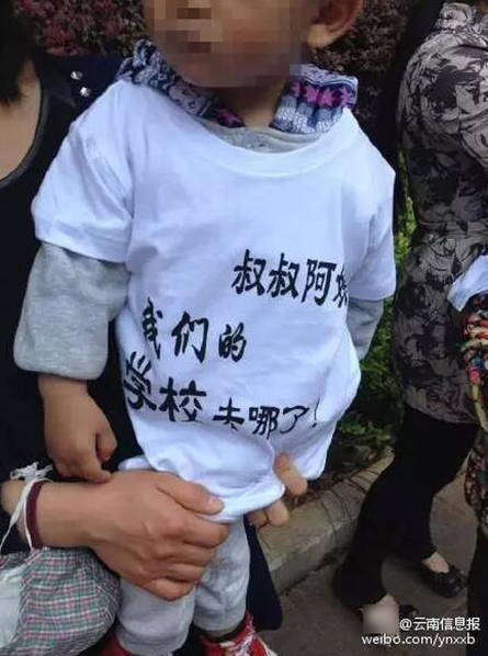 看到此景网友@永远追求真相表示,维权归维权希望不要带上孩子,天气太热,一会儿孩子要被晒中暑了。图为孩子衣服上写着“叔叔阿姨,我们的学校去哪了?”