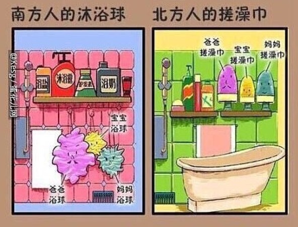 南方人的冲的确是冲,是没什么工具的。懒些的男人常常用凉水过一下水便搞定。而认真一些的也不过便是浴液-冲水-擦干这样一个简单的程序,绝没有北方人从上倒下搓个遍的复杂工程。