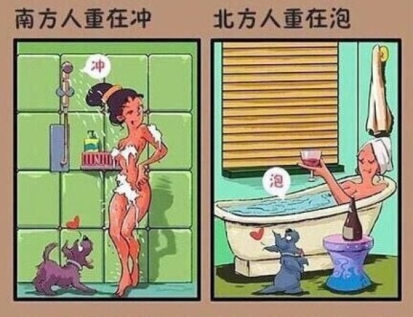 首先北方人的“洗”是因为“脏”;南方人的“冲”是因为“热”。所以北方人必须脏了才会“洗”;而南方人是因为热了才会不停地“冲”。