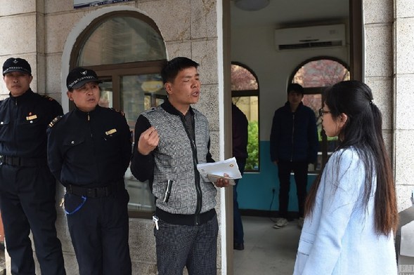 31岁的韩伟在打传办工作两年,他感受到打传的压力很大。图为韩伟在劝说一外地女孩不要进入小区。