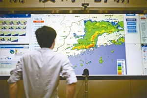 乘坐市气象局楼内逼仄狭小的电梯,李程一路来到位于9楼的深圳气象局突发事件预警信息发布中心大厅,这里整齐地布置着约90台显示屏幕:观测实况、卫星云图、雷达回波、数值预报来回切换。这里同时容纳着一个包括首席预报员、领班、短临、服务岗共计20多人的团队,为这座拥有一千多万人口的城市及时播报天气。作为预报员,既要快速抓取各种资料融会贯通,又要针对一种天气图反复拿捏回味;既不能对局部数据过度解读,也不能以偏概全。说起来容易,做起来难。