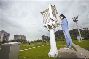 深圳市气象局园博园观测站的工作人员正在观测天气数据。