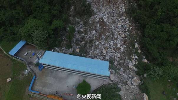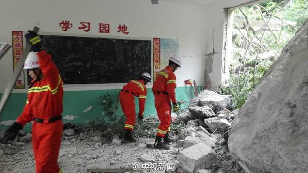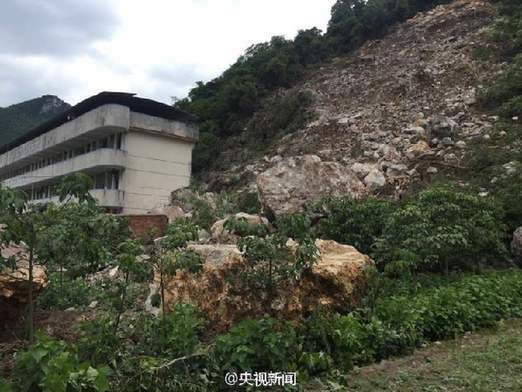 塌方致大量石块由山坡滚落到学校,导致21人受伤,其中学生20人。目前当地已展开救援全力救治伤员。事故未发现人员遭掩埋、伤者中没有重伤人员。图为现场。
