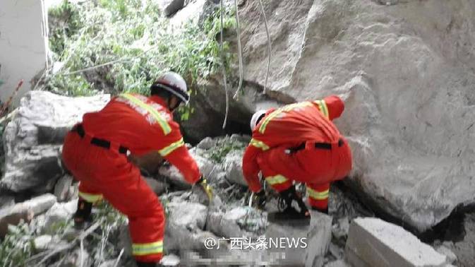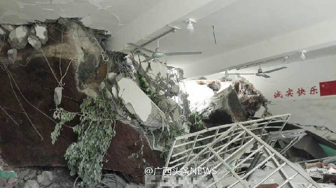融安县浮石镇六寮村小学旁边发生一起山体滑坡地质灾害,造成该小学一、二年级教室墙体倒塌,导致正在上课的21名小学生不同程度受伤。其中7人伤势较重,均无生命危险。事故原因调查等相关工作正在进行中。图为搜救现场。