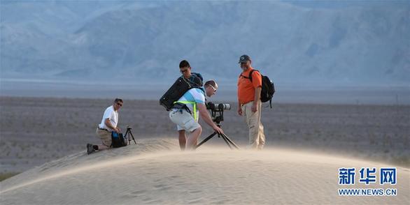 4月21日,在美国死亡谷国家公园内,几名摄影师在起风的沙漠上准备撤离。死亡谷国家公园位于美国加州和内华达州的沙漠谷地,是北美洲最低、最干旱的地区。炎热干旱的气候曾经使这里成为淘金客的葬身之地,“死亡谷”因此得名。亿万年的地壳运动使这片区域荟萃了盐湖、盆地、沙漠、戈壁以及山峰等多姿多彩的地貌环境。死亡谷于1994年成为美国国家公园。新华社记者杨磊摄