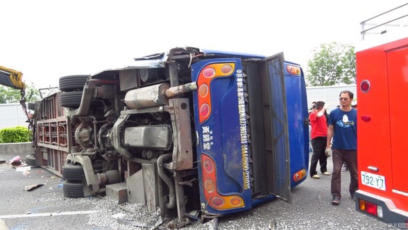 2016年04月25日,台湾省苗栗县,一辆载有大陆游客的游览车在行经台湾苗栗时,与一辆砂石车碰撞后翻覆,车上乘客、导游、司机共28人。事故致游览车司机伤重身亡,砂石车司机和20多名大陆游客受伤。据悉,全团旅客来自江苏省无锡市硕放镇。图为事故现场。联合报系/视觉中国
