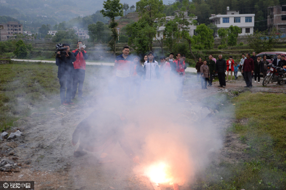 走到家门口,亲人们燃放鞭炮迎接袁丹回家。