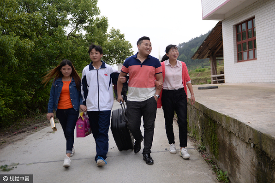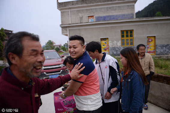 4月24日,袁丹在志愿者的陪同下从广州乘高铁抵返回湖南老家,一路上,除向志愿者表示谢意,袁丹很少说话,也许是在回想22年没有见过的母亲。下午6时许,袁丹回到老家,弟弟妹妹接过袁丹(左二)手中的行李,他热情地和迎接的亲戚打招呼。