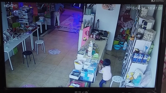 昨日,华商报记者查看监控发现,4月24日下午4时46分,一名二三十岁的女子带着一名穿着粉色衣服的小女孩从该店南门进入,站在柜台前咨询,而小女孩开始就坐在旁边的凳子上。