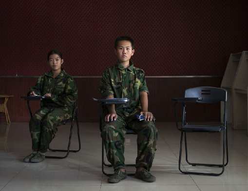 4月27日报道,在济南,有家军事化管理的网瘾少年改造训练营。摄影师Lorenzo Maccotta在里面呆了一个多星期,拍摄了这些青少年们的日常生活。图为网瘾训练营里,两名男孩正在上课。