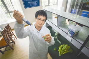 农场检测室的工作人员对蔬菜进行化验检测。