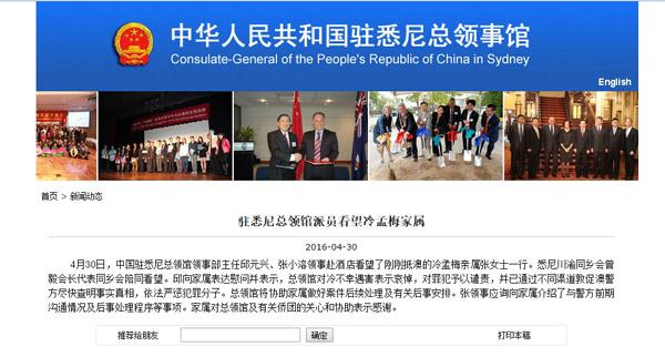 中国驻悉尼总领馆官网上的消息-驻悉尼总领馆派员看望冷孟梅家属