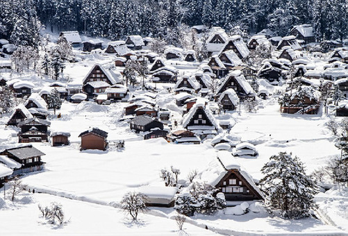 日本冈山(Gokayama)附近白川乡(Shirakawa-go)的三角形住宅,这个偏远山村已经被列入联合国教科文组织世界遗产名录。(网页截图)
